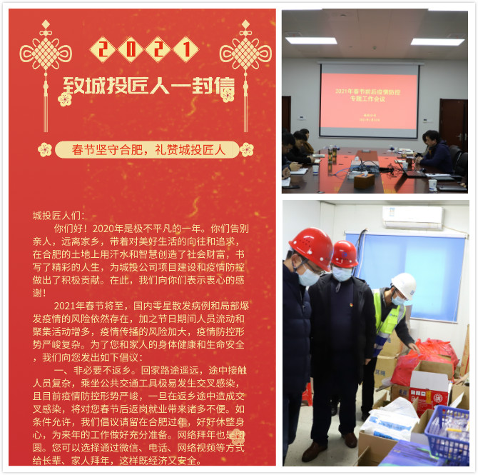 伟德国际victor1946公司为广大建设者精心准备《致伟德国际victor1946匠人一封信》,通过公司微信公众号、现场宣传等方式广泛宣传,号召伟德国际victor1946匠人们非必要不返乡、返乡前按要求报备、如需返乡途中重防护、春节返岗服管控,网络拜年也是团圆,尽量留在合肥过年,休整身心迎接来年工作。