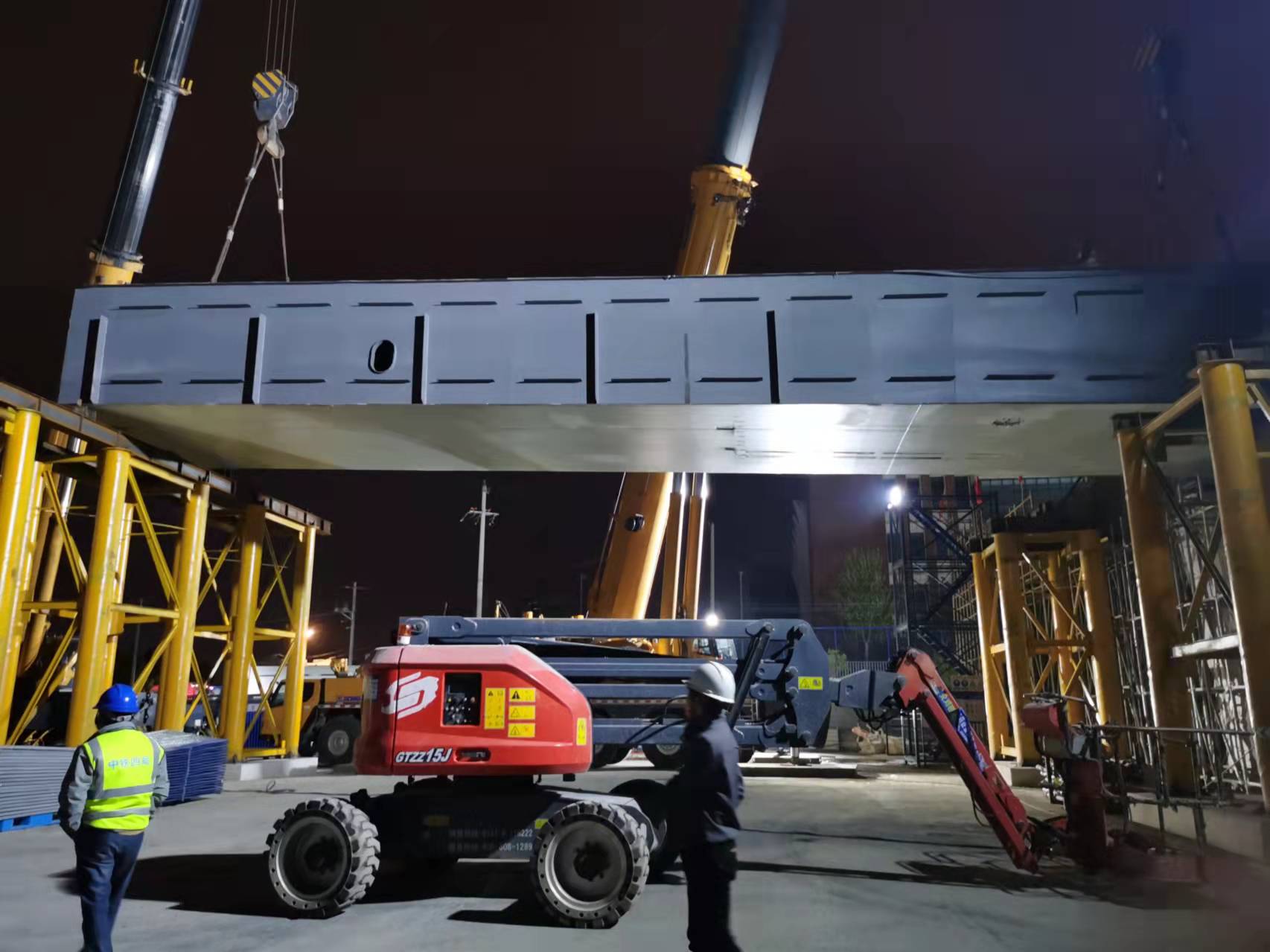 为确保首联钢箱梁顺利吊装,项目办认真组织,积极筹划,以安全、精准为原则,做好吊装前的各项准备工作。一是召开吊装施工技术交底会部署吊装工作,认真讨论吊装施工细节,确保吊装每一个环节处于可控状态。二是积极与交警部门联系配合封闭管制宿松路西侧部分道路,为钢箱梁运输车的停放提供了空间。三是由安质部做好安全质量班前讲话,增强施工作业人员的安全意识,加强对现场安全质量隐患排查力度,严格汽车吊进场验收手续,要求司机必须持证上岗,确定吊车停放位置及吊点,保证钢箱梁吊装顺利进行,杜绝安全事故发生。四是在吊装过程中,项目办坚持领导带班及施工旁站制度,在关键部位和关键工序设专人盯控,确保钢箱梁准确就位。